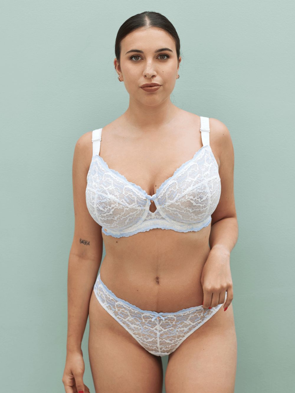The lace is applied to the back leg opening (allowing for an elastic-free finish that combines comfort and invisibility)
