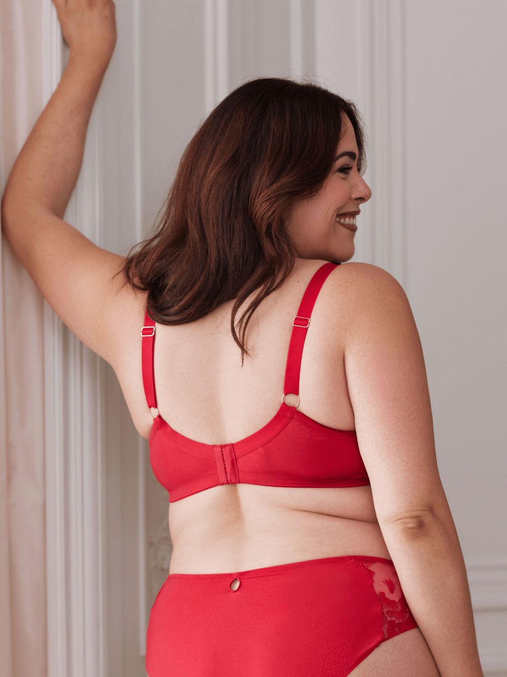 Reinforced support for larger sizes: basque under the cups, lined back, addition of a half-moon inside the cups, width of straps and height of back fastening adapted