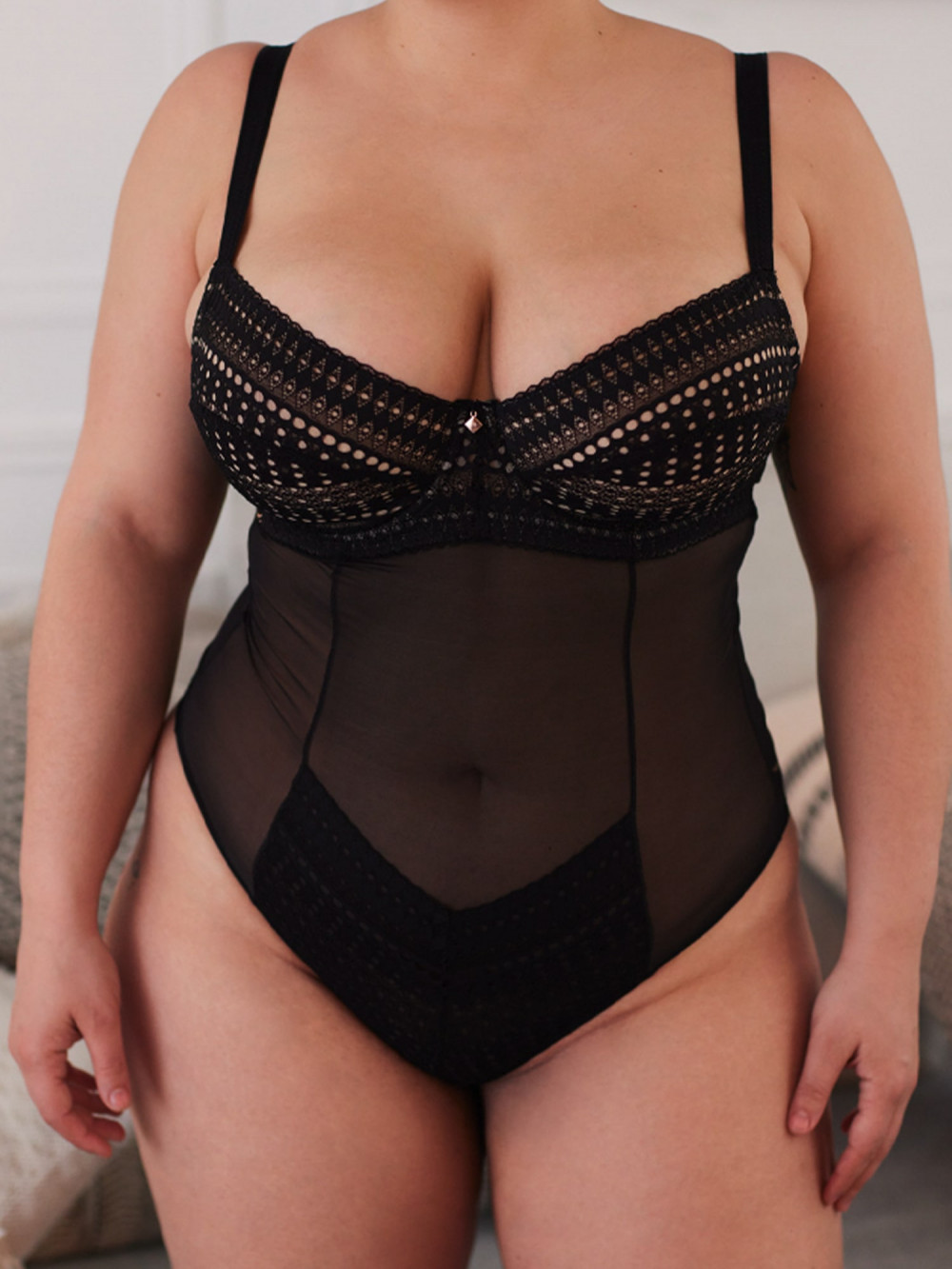 - Corps en tulle avec application de dentelle sur la partie tanga du body